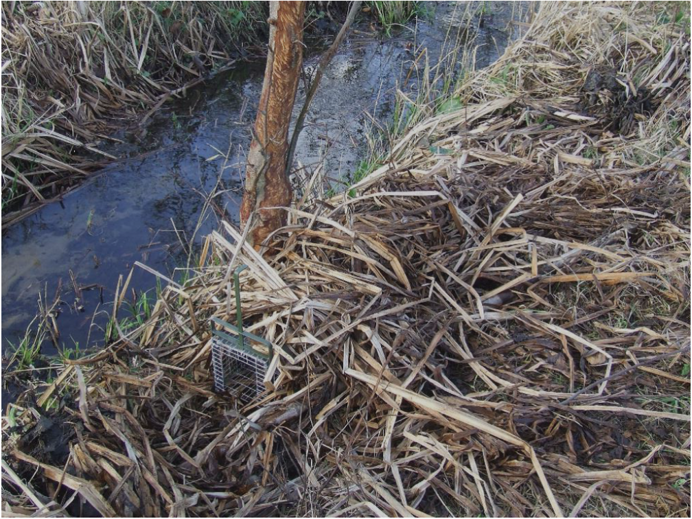 Piège camouflé, posé sur une berge et calé contre un arbre (©GREGE)